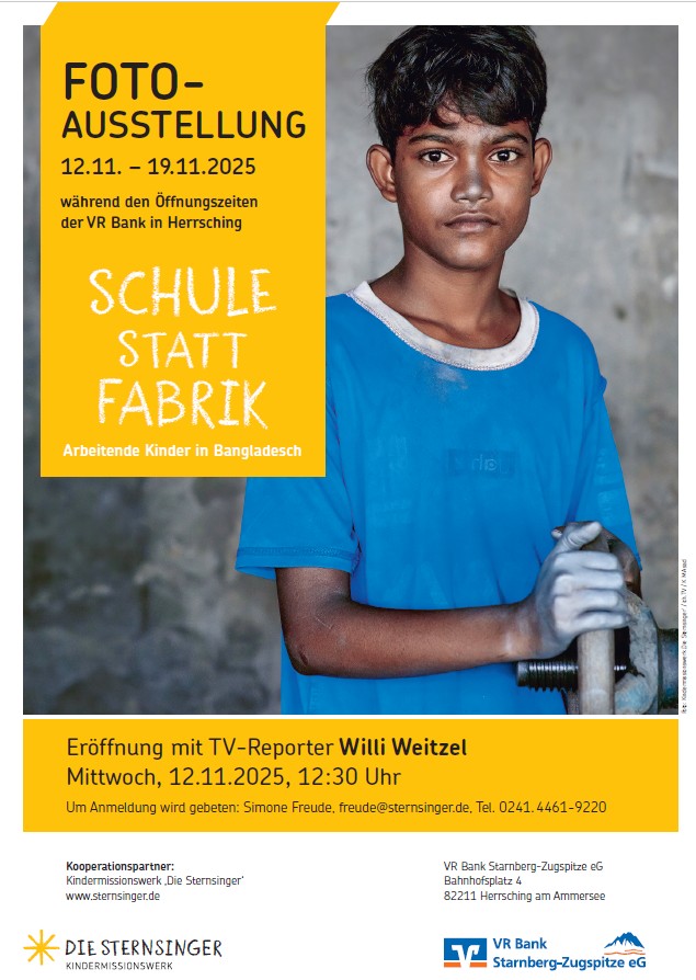 Foto-Ausstellung "Schule statt Fabrik" während der Öffnungszeiten der VR-Bank in Herrsching.